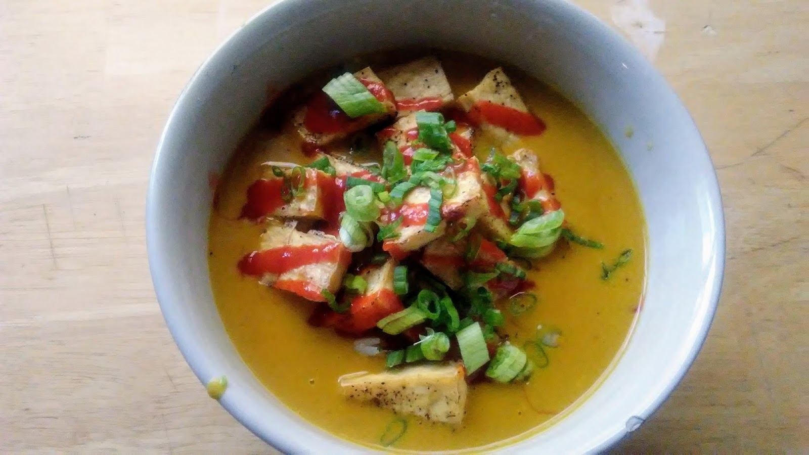 This is the delicious coconut curry butternut squash soup I made the other day. It was so easy thanks to the canned butternut squash I got from Trader Joe's. I just sauteed some garlic in a little coconut oil, and added some curry powder and crushed red pepper. Then I added the squash and a can of coconut milk. I let it all simmer while I cooked some rice and baked some tofu for croutons.
